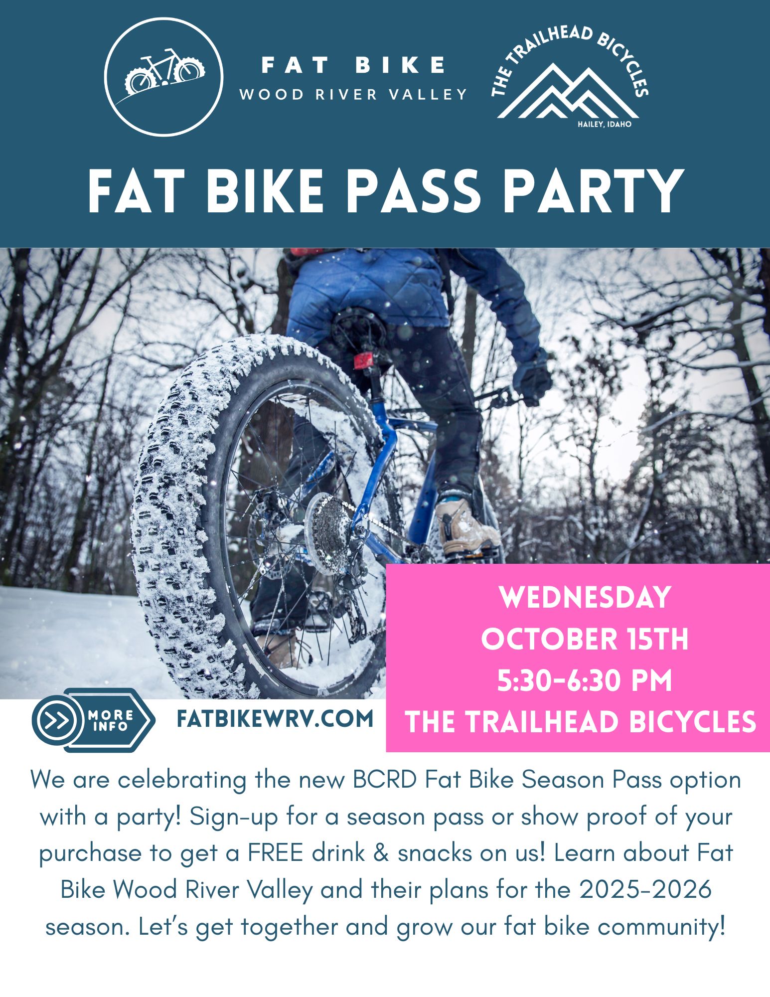 Come to The Trailhead Bicycles for a one-hour social gathering to celebrate the launch of the very first Fat Bike Trail Pass from the Blaine County Recreation District (BCRD). This is your chance to be part of history – help us kick off a new era of winter fat biking in the Wood River Valley by grabbing your Fat Bike Trail Pass at the party!