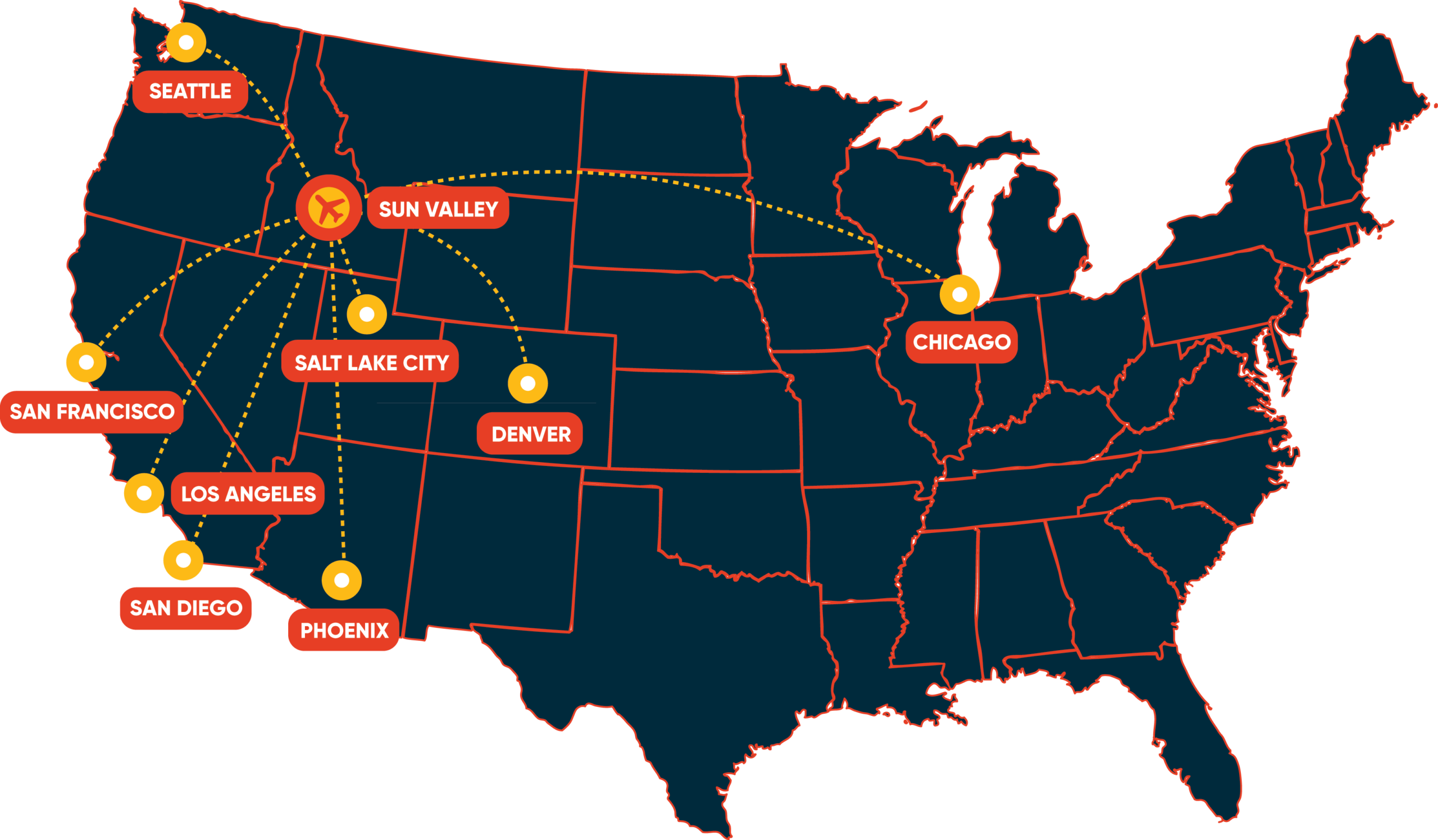 Flying into Sun Valley has never been easier. Nonstop flights to Sun Valley are now available from Chicago, Denver, Phoenix, San Diego, Los Angeles, San Francisco, Seattle, and Salt Lake. And better yet, it’s only a 20 minute ride from the airport in Hailey to the slopes in Sun Valley, meaning you can literally fly into town and be on the lifts in practically no time!