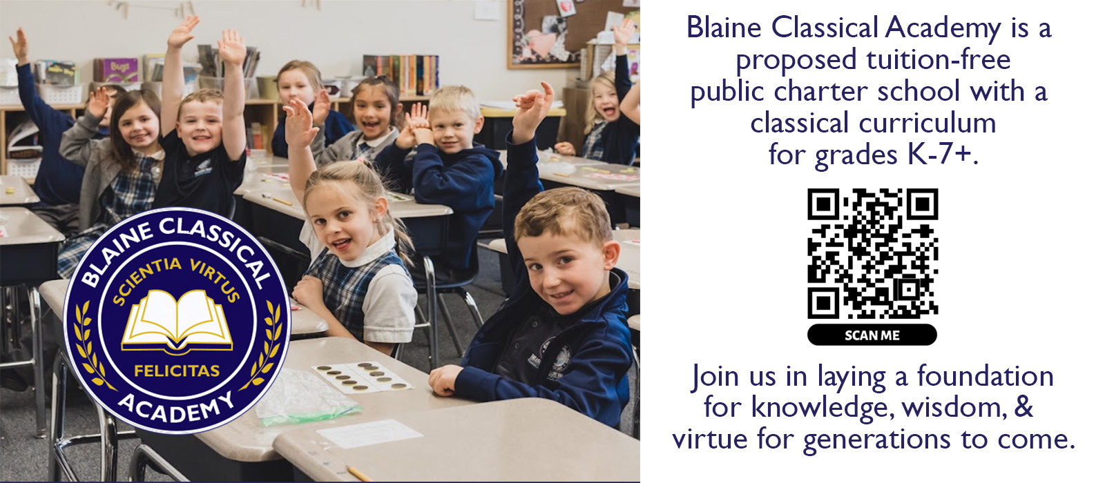 Blaine Classical Academy is a proposed tuition-free public charter school with a classical curriculum for grades K-7+, slated to open in the Fall of 2028. A grade will be added each year through grade 12.